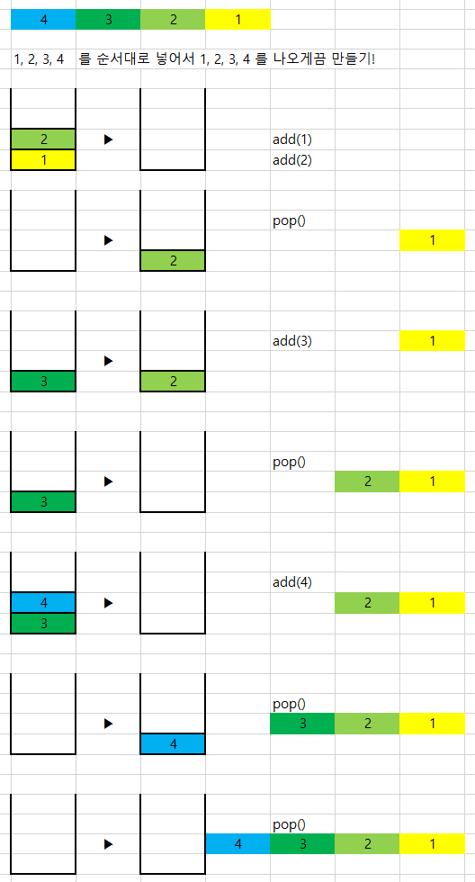 선입후출을 이용해, 마치 선입선출처럼 동작하게끔 할 수 있습니다. 아래 그림을 통해 이해해봅시다.