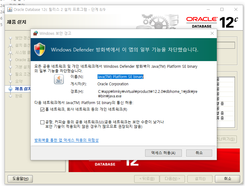 계속 진행하다 보면, Java 관련 방화벽 허용 팝업창이 뜨는데, 엑세스 허용해주세요