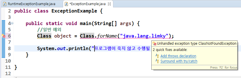 위 코드에서 볼 수 있듯이..컴파일러는 자동으로 일반예외를 감지하고 예외 처리 코드를 사용하도록 강제합니다. 만약 예외 처리 코드를 구현하지 않으면 프로그램 실행 조차 할 수 없겠죠?
