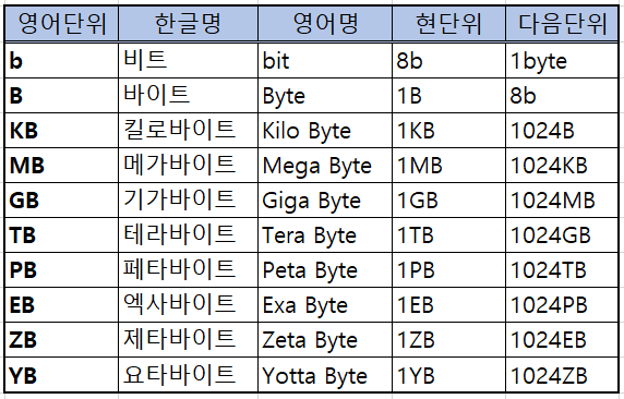 [일반IT] 컴퓨터 용량 단위표(byte,KB,MB,GB..등) 본문