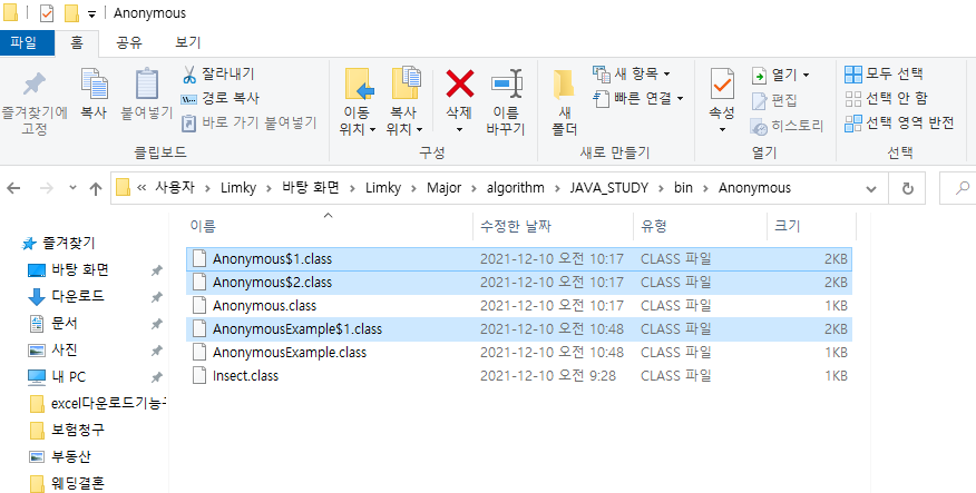 보통 .java 파일이 .class 파일과 1:1관계를 맺지만 익명객체(익명클래스)가 사용된 .java 파일을 컴파일 하게되면 .class 파일 뿐만 아니라 $.class를 떨구게 됩니다.
