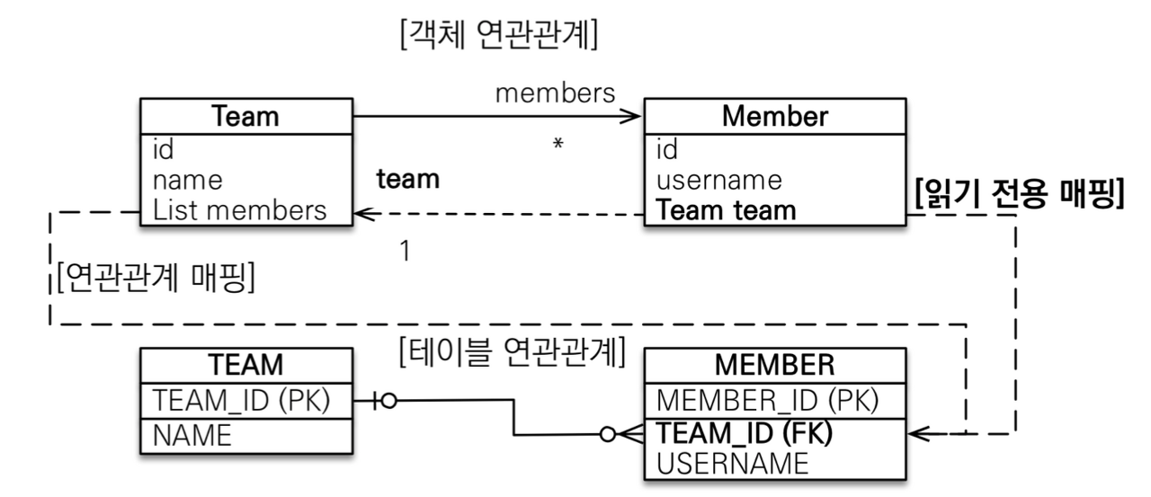 그렇다고 일대다 양방향 매핑이 완전히 불가능하지는 않다. 일대다 단방향 매핑 반대편에 같은 외래 키를 사용하는 다대일 단방행 매핑을 읽기 전용으로 추가하면 된다.
