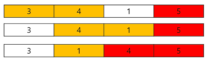 그림을 보면서 이해해 봅시다. 우선 5와 3을 비교하고 5가 더 크기 때문에 교환합니다.