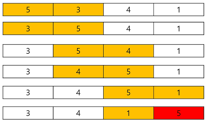 다음 버블인 5와 4를 비교하고 5가 더 크기 때문에 교환합니다. 이제 5와 1을 비교하고 5가 더 크기 때문에 교환한 후 정렬 1회전을 종료합니다. 5가 가장 큰 수였기 때문에 차례대로 진행되는 모든 비교에서 이기고 결국 제일 큰 숫자의 자리인 끝의 자리를 차지하게 됩니다.