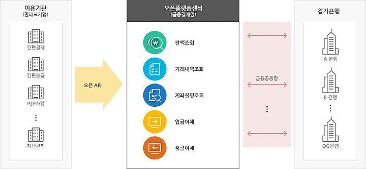 금융 오픈 API 또는 금융 오픈플랫폼은 핀테크기업이 금융서비스를 편리하게 개발 할 수 있도록 은행의 금융서비스를 표준화된 형태로 제공하는 인프라를 말합니다. 여기엔 오픈 API와 테스트베드로 구성되어있습니다.