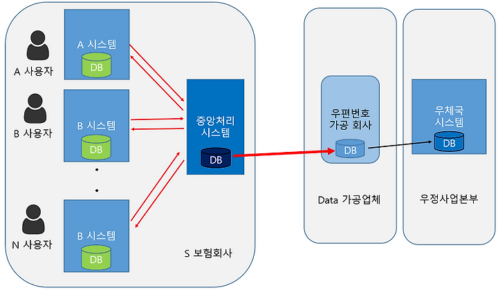또한, S보험시스템엔 A, B, C .... 등 여러개의 시스템이 있지만 이 시스템이 개별적으로 우체국 시스템 DB에 접근한다면, 비효율적일 것입니다. 따라서 이를 대표할 수 있는 중앙처리 시스템이 대표로 한번만 우체국 시스템의 DB에 접근해 우편번호를 가져오는 것입니다! <- 일괄처리 개념이죠!?