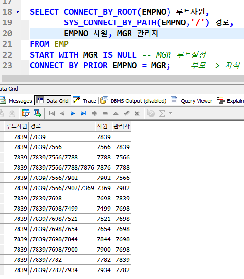 즉, 현재 7566 사원이 전개 데이터이면, 경로는 7839/7566 이며, 7839는 관리자가 없는 최상위 루트 데이터 입니다.