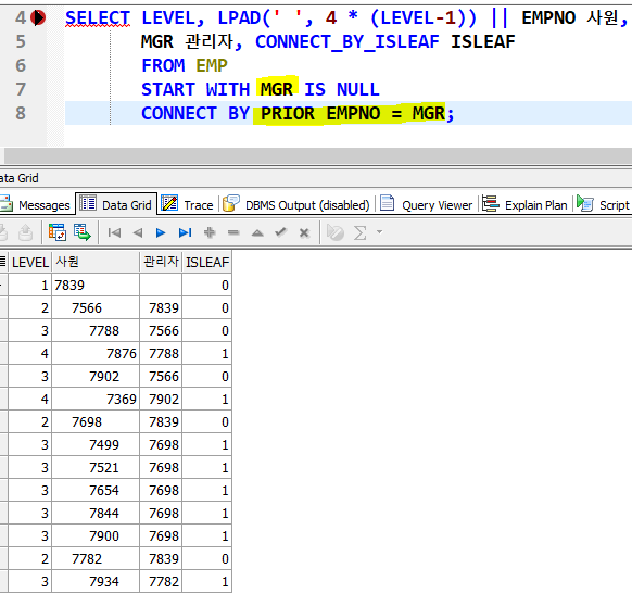 이역시 마찬가지로 START WITH MGR IS NULL 이라는 구문을 통해 최상위 루트 데이터부터 전개를 시작할 것임을 알 수 있으며,