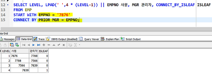 START WITH EMPNO = '7876' 을 통해, 시작 컬럼이 사원번호 7876 임을 알 수 있습니다.