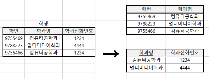 - 학과에 속한 학생이 늘어날수록 학과명과 학과번호가 중복으로 나타납니다. 만약 갱신시 하나라도 갱신하지 못하면 갱신이상을 발생시키기 때문에 문제가 될 수 있습니다.
