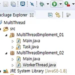 멀티스레드 구현 2번째 시간 일전에 스레드를 만드는 방법 2가지가 있다고 소개했었다. 1. java.lang.thread 클래스를 직접 객체화해서 생성 2. Thread를 상속받아 하위클래스에서 구현하는 방법. 오늘은 두번째 방법인 작업스레드가 Runnable 인터페이스를 구현시켜 만든 Task(작업스레드가 작업할 일)을 따로 구현하지 않고 Thread를 상속받아 하위클래스에서 run()메서드를 오버라이딩해서 구현하는 방법을 소개한다. 간단하다. 아래 코드를 보자. MultiThreadImplement_02 패키지를 보면 WokerThread 클래스는 Thread를 상속받아 run()메서드를 오버라이딩해서 구현했다. package MultiThreadImplement_02; public class Wor..